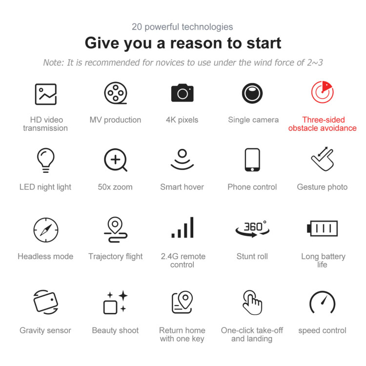 کیفیت ساخت بالا، دارای دو دوربین، دارای کیف، دارای تمامی سنسور ها طبق توضیحات، برد پروازی تا ۱۲۰ الی ۲۰۰ متر، قابلیت اتصال ب موبایل، دارای پره های رزرو، دارای دو باتری، وزن سبک، پرواز پایدار، دارای کلید پشتک (حرکت نمایشی)، چرخش ۳۶۰ درجه، ایمنی خاموشی در لحظه، سنسور جلوگیری از برخورد با اشیا، بسیار مقاوم در برابر ضربه، تغییر زاویه دوربین و صدها قابلیت دیگر