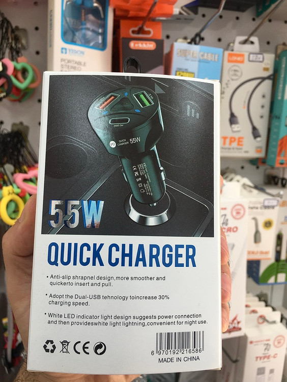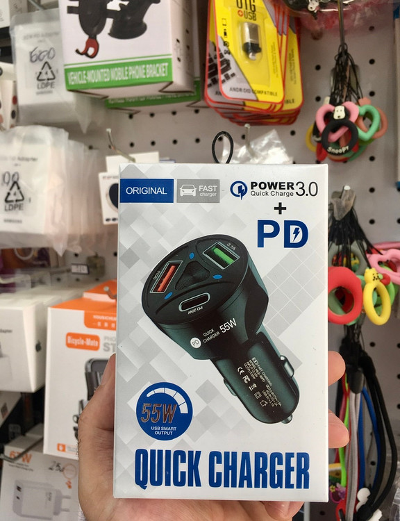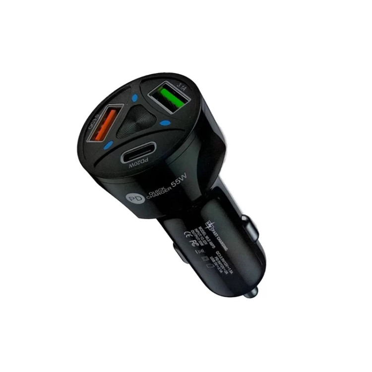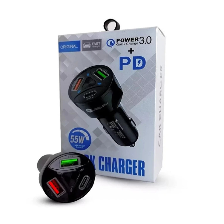 شارژر فندکی با قابلیت PD فست شارژ تا 55 وات به صورت هوشمند دارای 2 پورت یو اس بی و یک پورت تایپ سی تا 3 آمپر مناسب تمام گوشی و تبلت ها و کلیه دستگاه های هوشمند