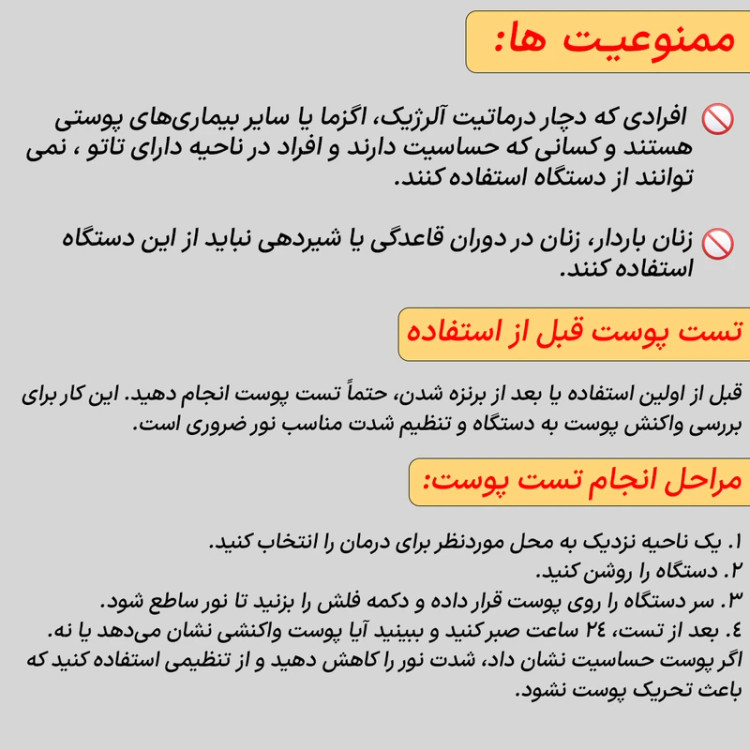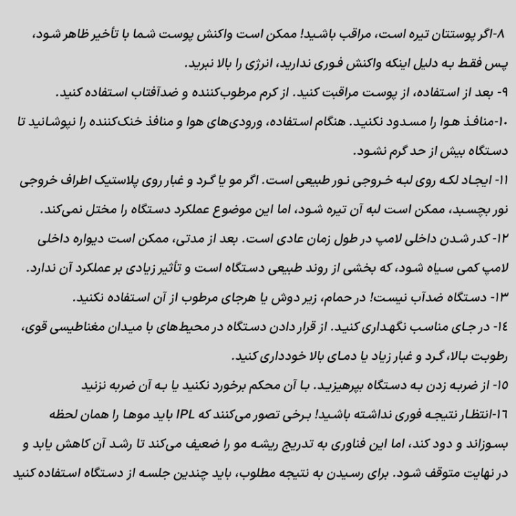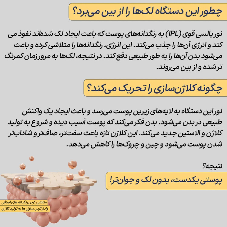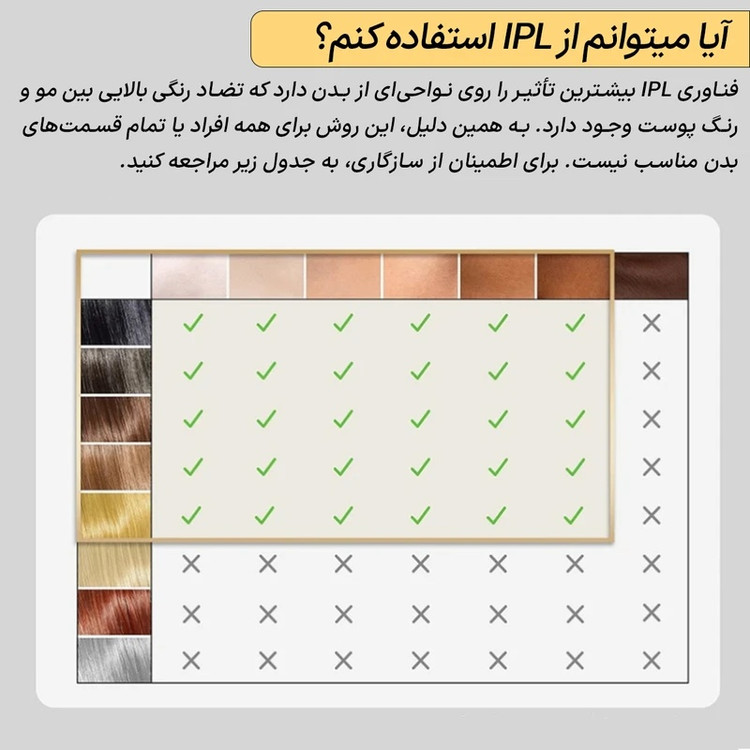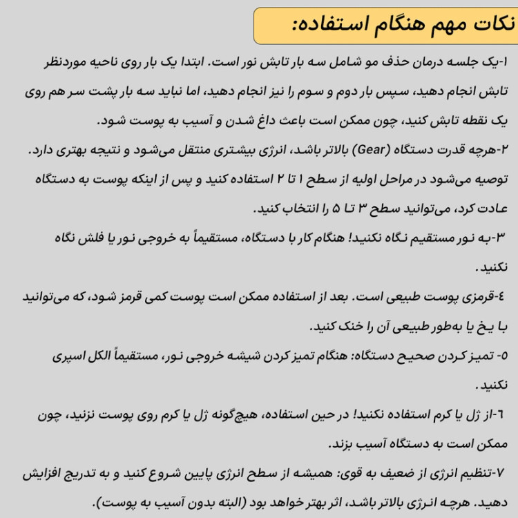 دستگاه از فناوری IPL 3.0 با طول موج 570 تا 1100 نانومتر استفاده میکند که باعث نفوذ سریعتر نور قرمز به ریشه مو شده و تأثیر بهتریدر کاهش رشد موها دارد