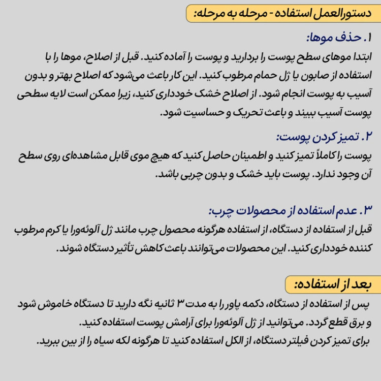 اقلام همراه: دستگاه، آداپتور، عینک، ژیلت