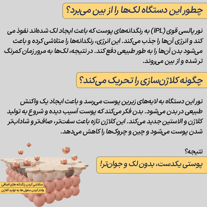 دستگاه از فناوری IPL 3.0 با طول موج 570 تا 1100 نانومتر استفاده میکند که باعث نفوذ سریعتر نور قرمز به ریشه مو شده و تأثیر بهتریدر کاهش رشد موها دارد